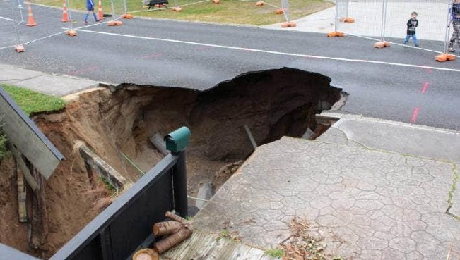 In August 2018 a burst water main caused a sinkhole on Arrowsmith Avenue, Taupō (source: Stuff)
